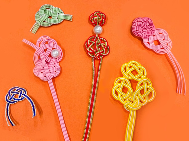 - 古くから、贈答品の包みなどを結ぶために用いられてきた「水引」。結び方や色の組み合わせで願いや思いを表すことができるものとして使われてきました。「梅結び」「あわじ結び」でオリジナルの栞を作ります。