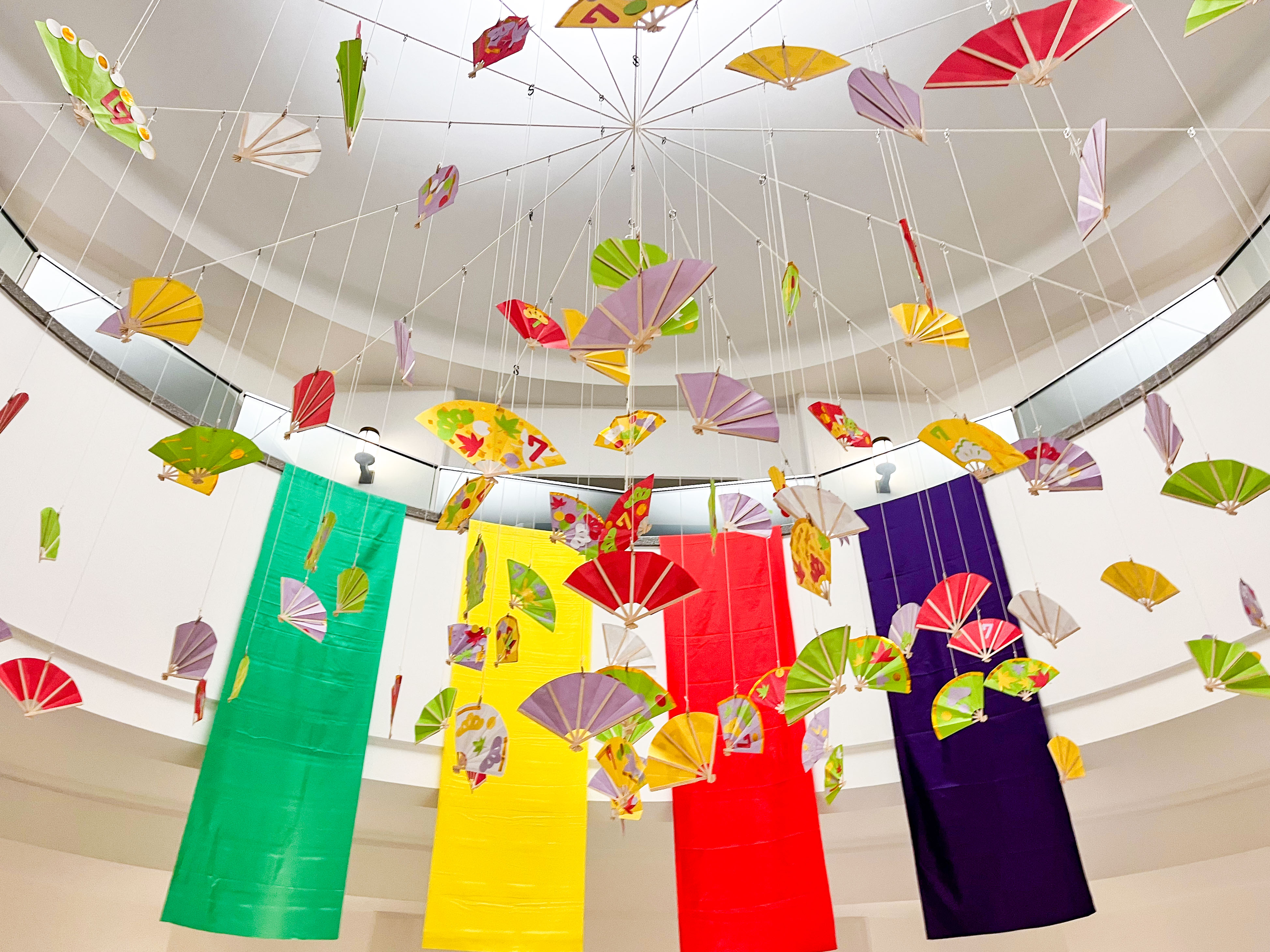 11月の1か月間、みんなで作った色とりどりな扇子を4階中央ホールにディスプレイ。能楽堂の揚げ幕をイメージした配色とともに、優雅に舞う扇で7周年を彩ります。